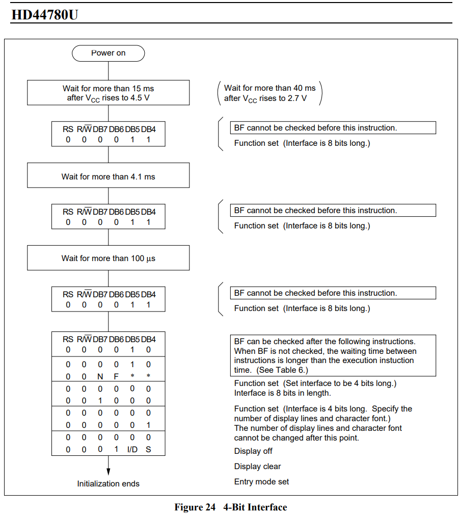 - 위 그림은 HD44780U LCD 디스플레이를 4bit 모드를 기준으로 초기화 하는 방법이다.