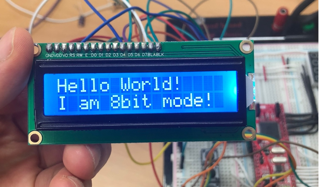 - 초기화 작업이 끝나면 1행에는 "Hello World!", 2행에는 "I am 8bit mode!" 문자열을 출력하도록 하였다.