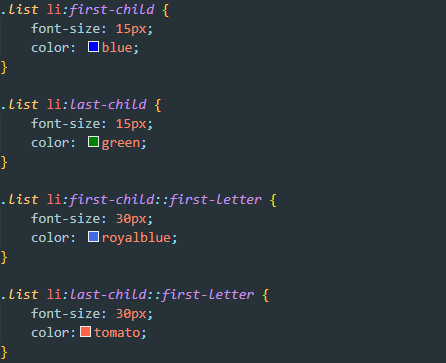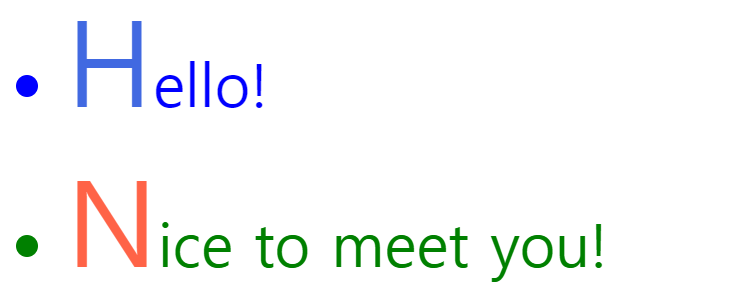 - ::first-letter - li내의 첫번째 글자를 감싸고 있는 요소가 없어도 있는 것과 같이 제어 가능