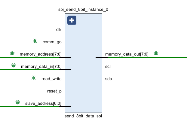 - sned_8bit_data_spi 모듈은 parameter값으로 전달 받은 8bit memory_data_in 값을 I2C 통신을 통해 전송하는 모듈이다. ( 이름은 SPI로 되어 있으나, I2C 통신을 사용한다. 최근 SPI 통신을 하다보니, SPI 라고 잘못 적었다. ㅠㅠ )