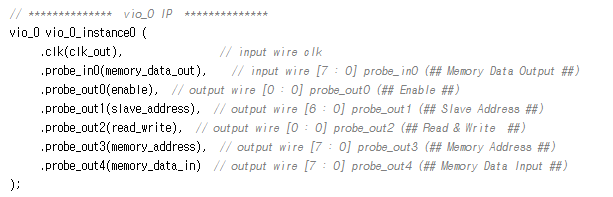 ▶ memory_data_in (8bit, EEPROM 메모리에 쓰고자 하는 데이터) - Virtual IO IP 관점에서 I2C 모듈에게 필요한 데이터를 전송하게 된다. 따라서 VIO IP 관점에서의 Output은 I2C 모듈의 Input과 동일한다.