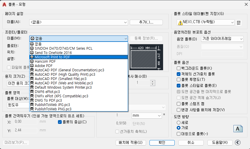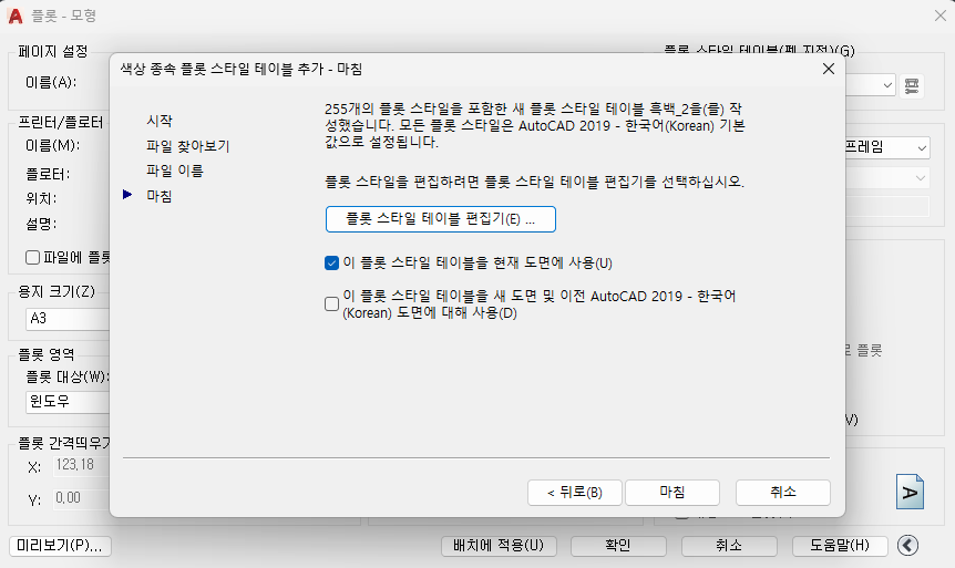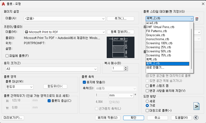 11) 플롯 스타일 테이블 항목에서 생성된 항목을 확인한 후, 다른 항목 클릭했다가 새로 생성된 항목 클릭