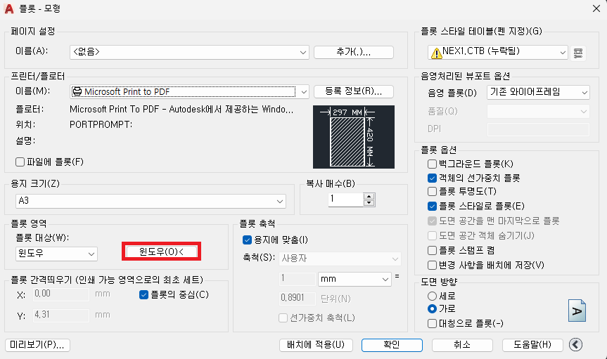 4) 윈도우(O) < 버튼 클릭한 후, PDF화하고자 하는 도면 영역 드레그
