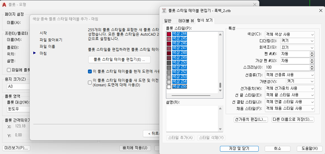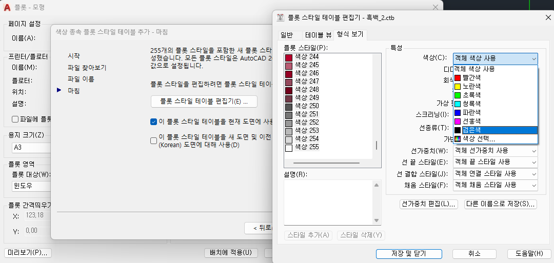 9) Shift 버튼 누른 상태에서 플롯 스타일 항목의 색상에서 색상 1과 색상 255 클릭하여 모든 색상 선택