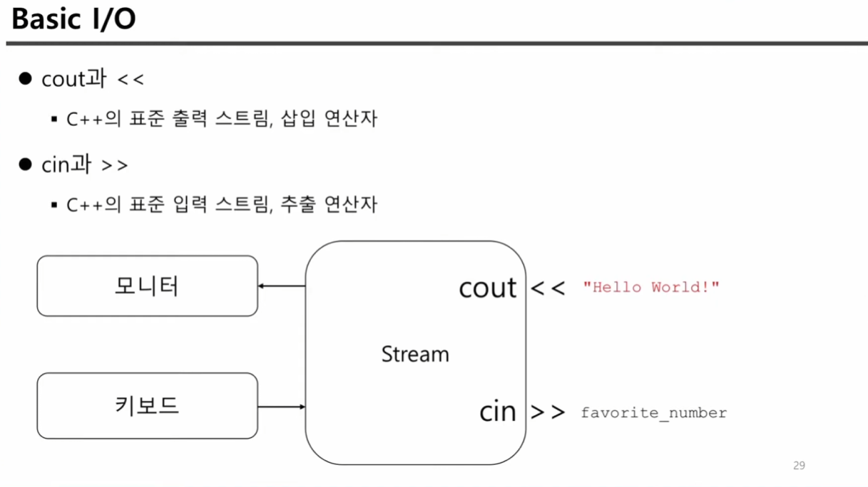- cout과 <<을 통해 문자열 출력 뿐만 아니라 cin과 >>을 통해 문자열 입력 받을 수 있다.
