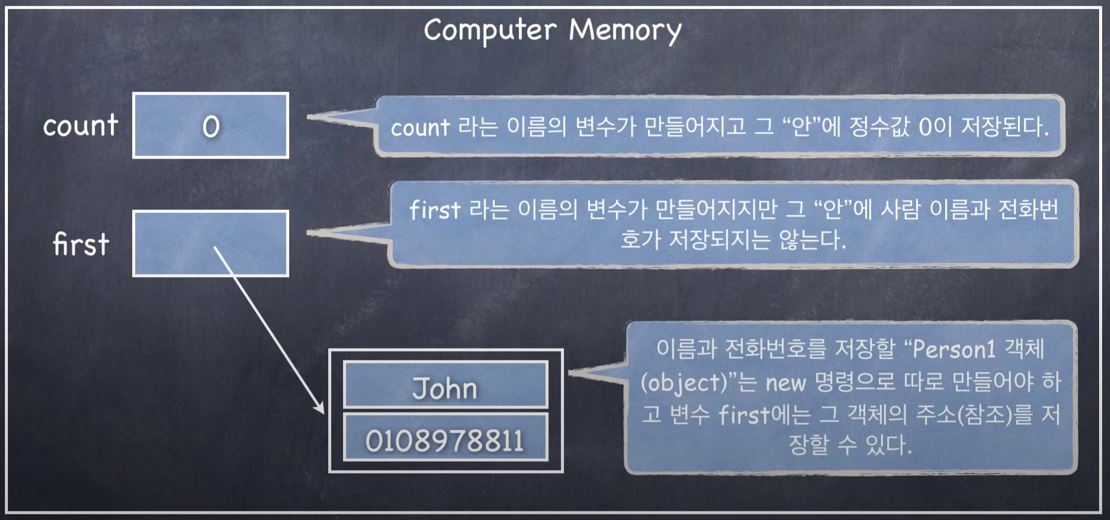 ▶ "Person1" 사용자 정의 타입의 first 객체(=인스턴스)가 생성되었고, new 명령어를 통해 "Person 1" 타입의 객체가 생성되었다. 이때의 객체는 이름이 없는 객체이며, 이 객체안에 사람의 이름과 전화번호를 저장한다. 그리고, first 객체는 데이터가 저장된 이름없는 객체의 주소(참조) 정보를 저장하고 있으며, first 객체를 "참조 변수"라 한다.